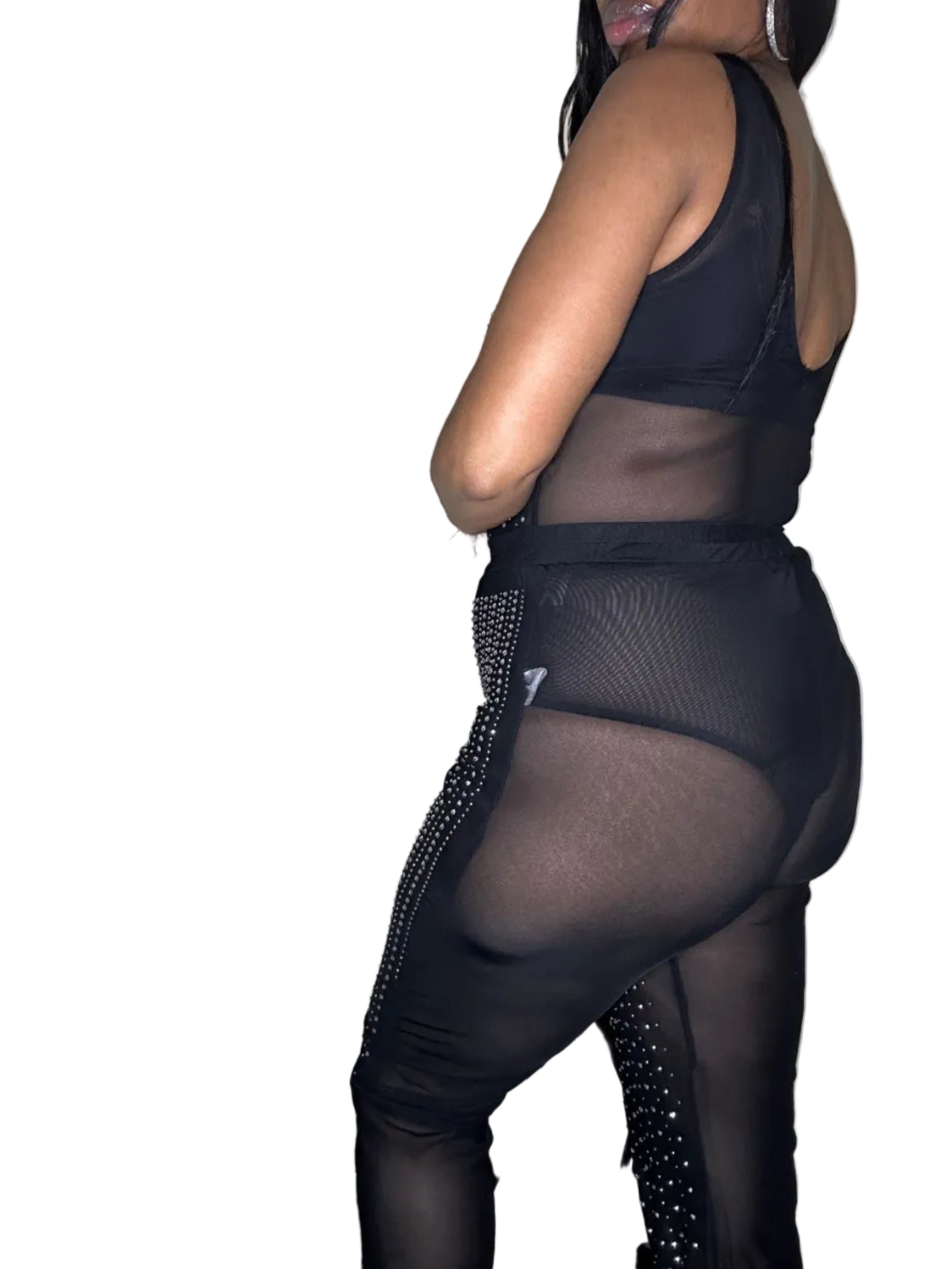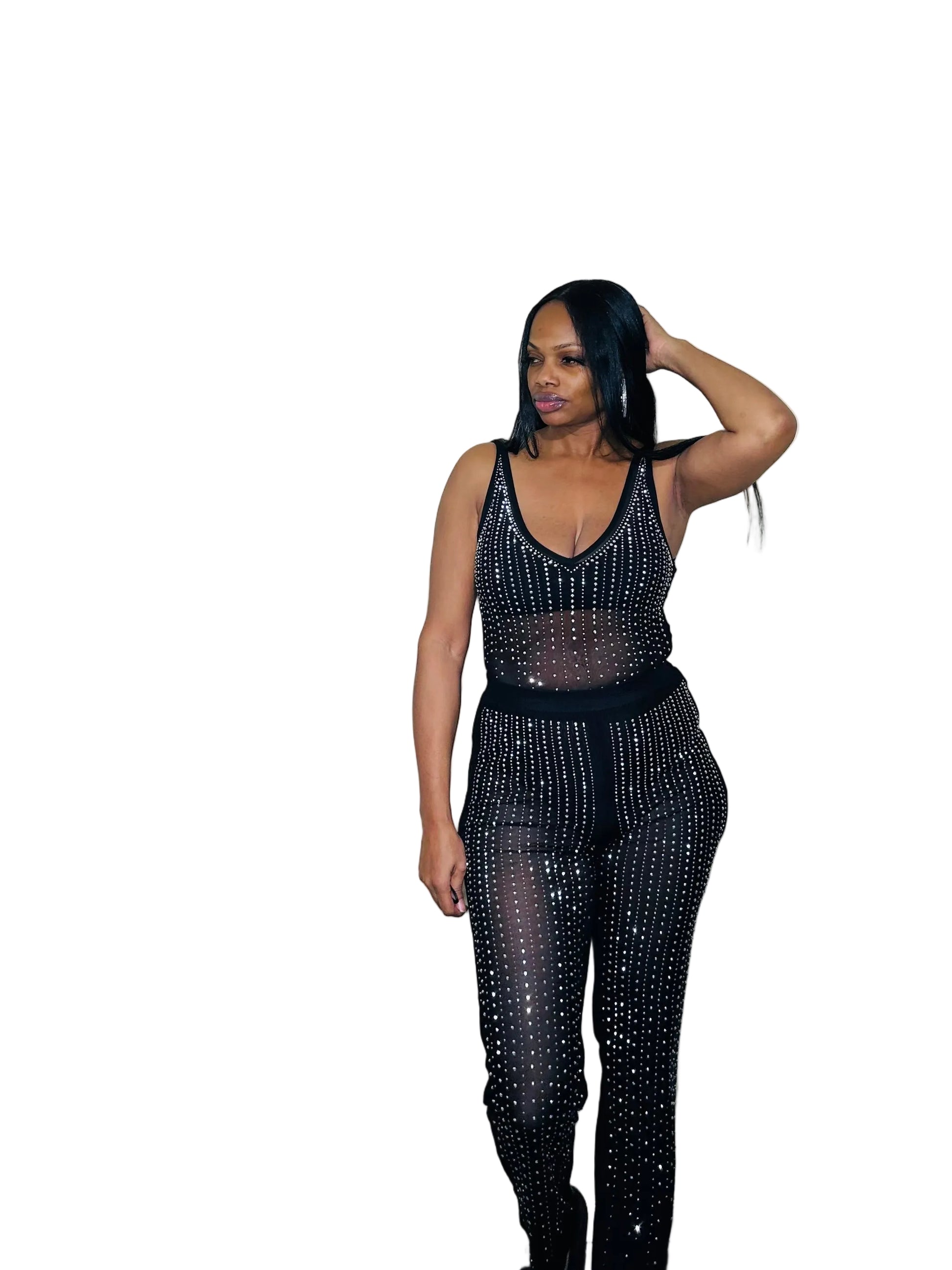 **Keywords:** Women's Bodysuit, Elastic Waist Pants, Mesh Studs, Sleeveless Bodysuit, 2PC Set, Nylon Spandex Blend, Polyester Spandex Pants, Trendy Women's Outfits, Stylish Women's Clothing.