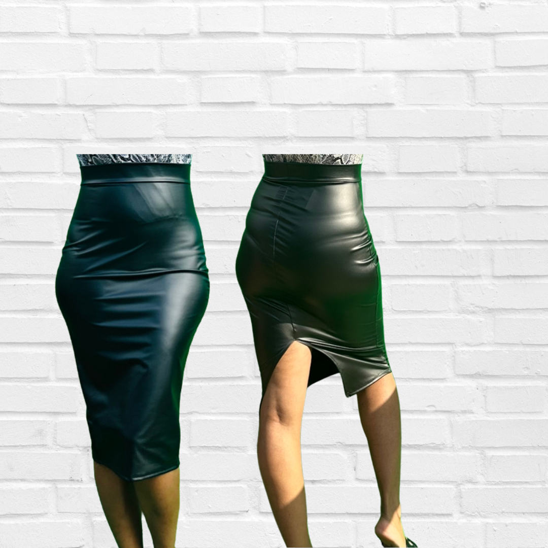 Introducing our high waist solid pencil skirt, a timeless wardrobe essential that exudes sophistication and style. Crafted from premium vegan leather, this skirt offers the perfect combination of comfort, durability, and a sleek aesthetic.