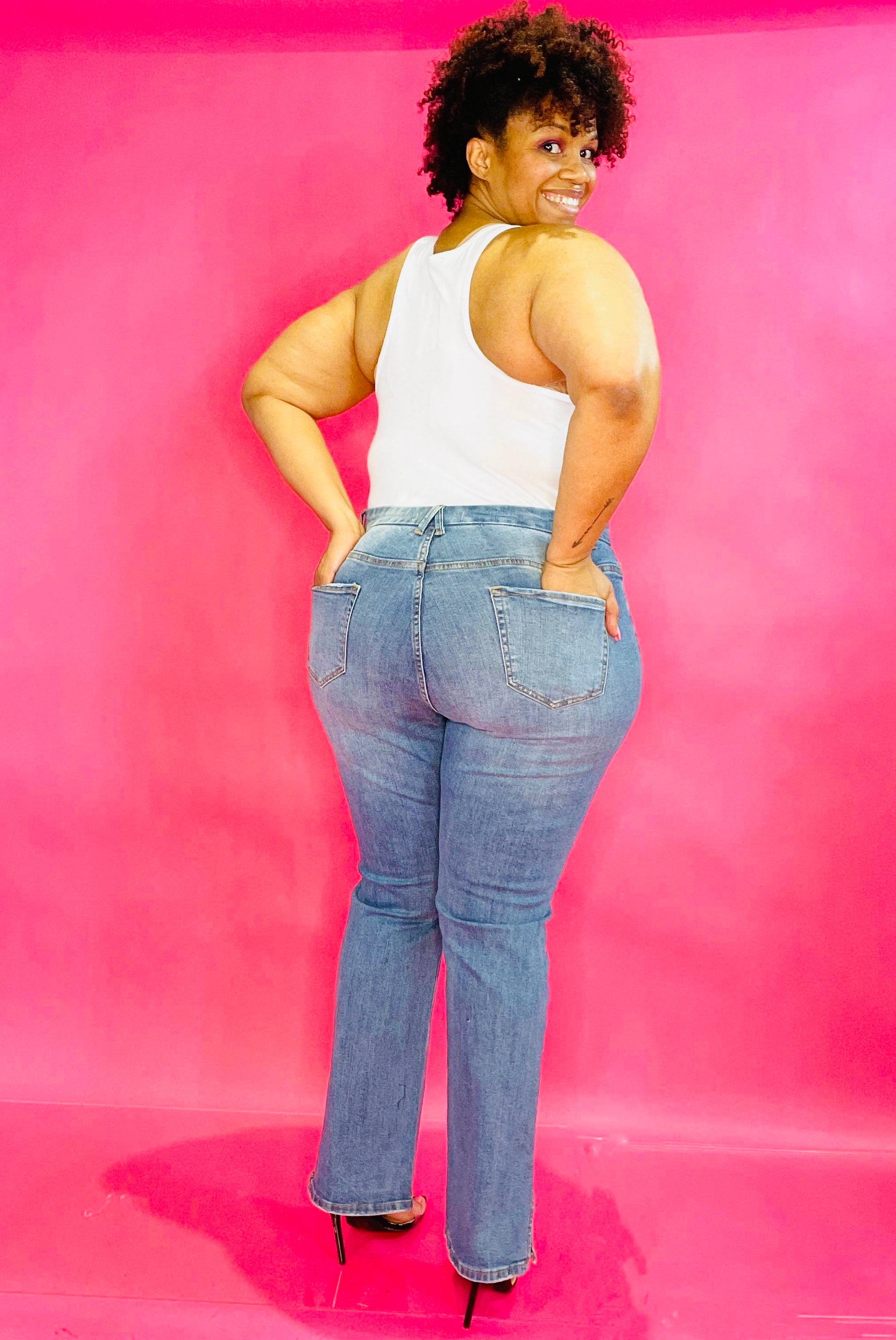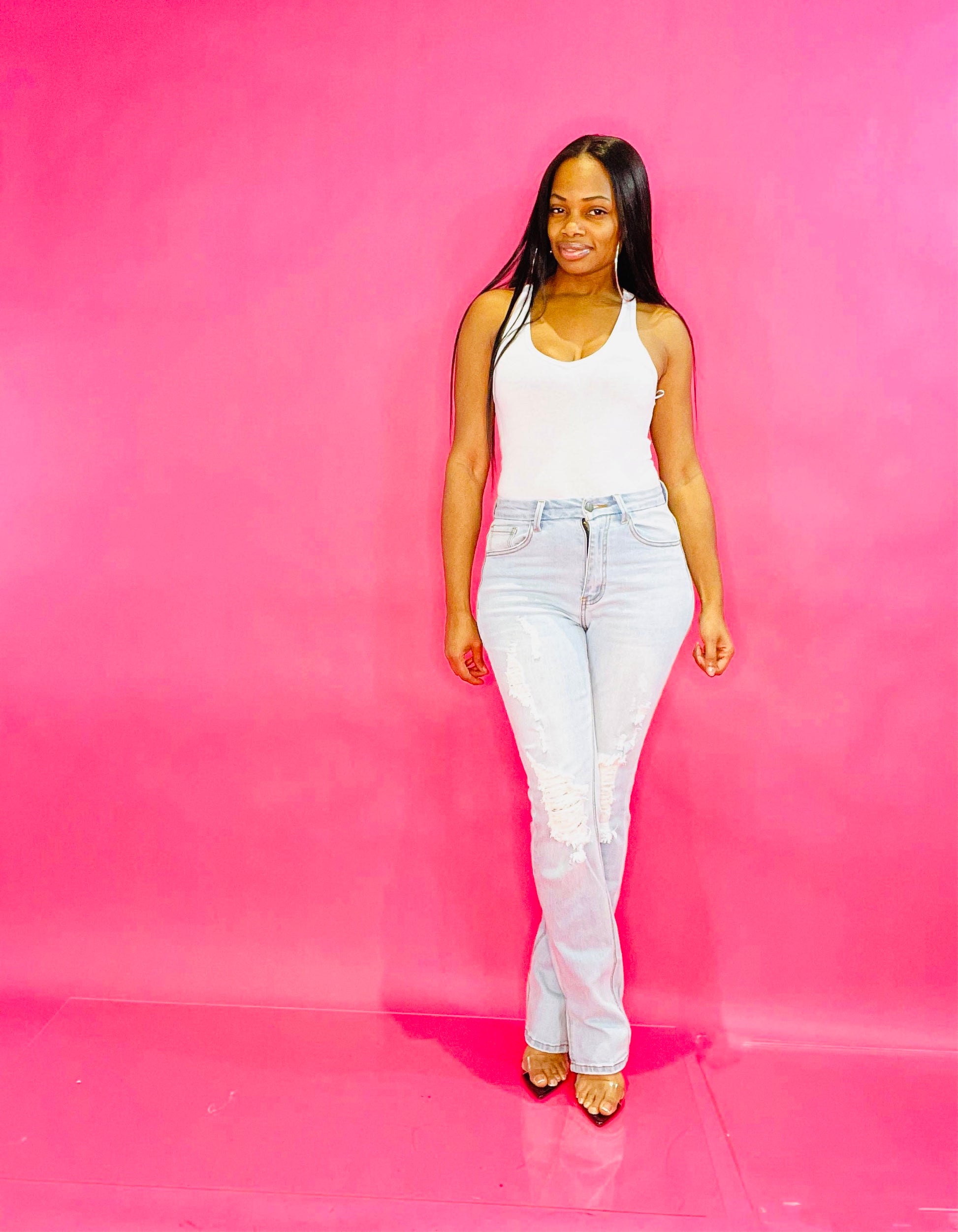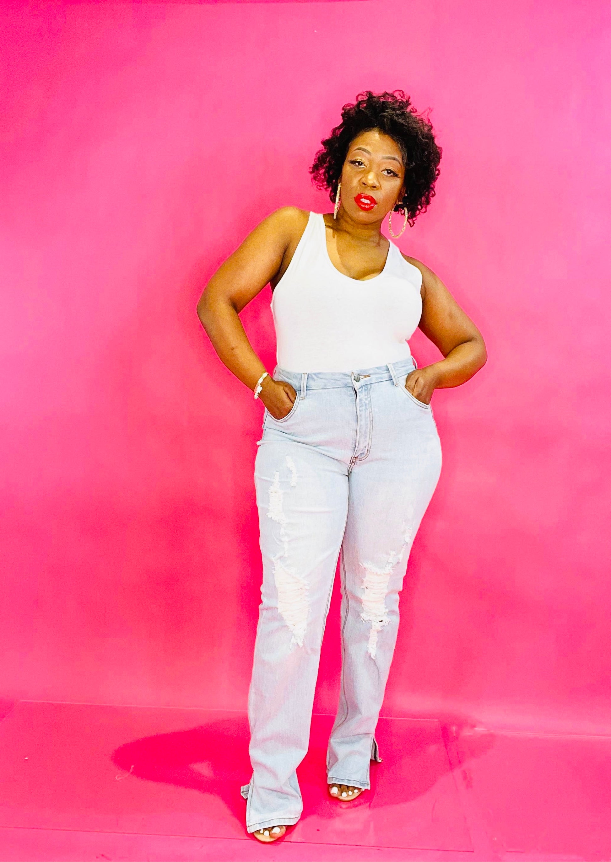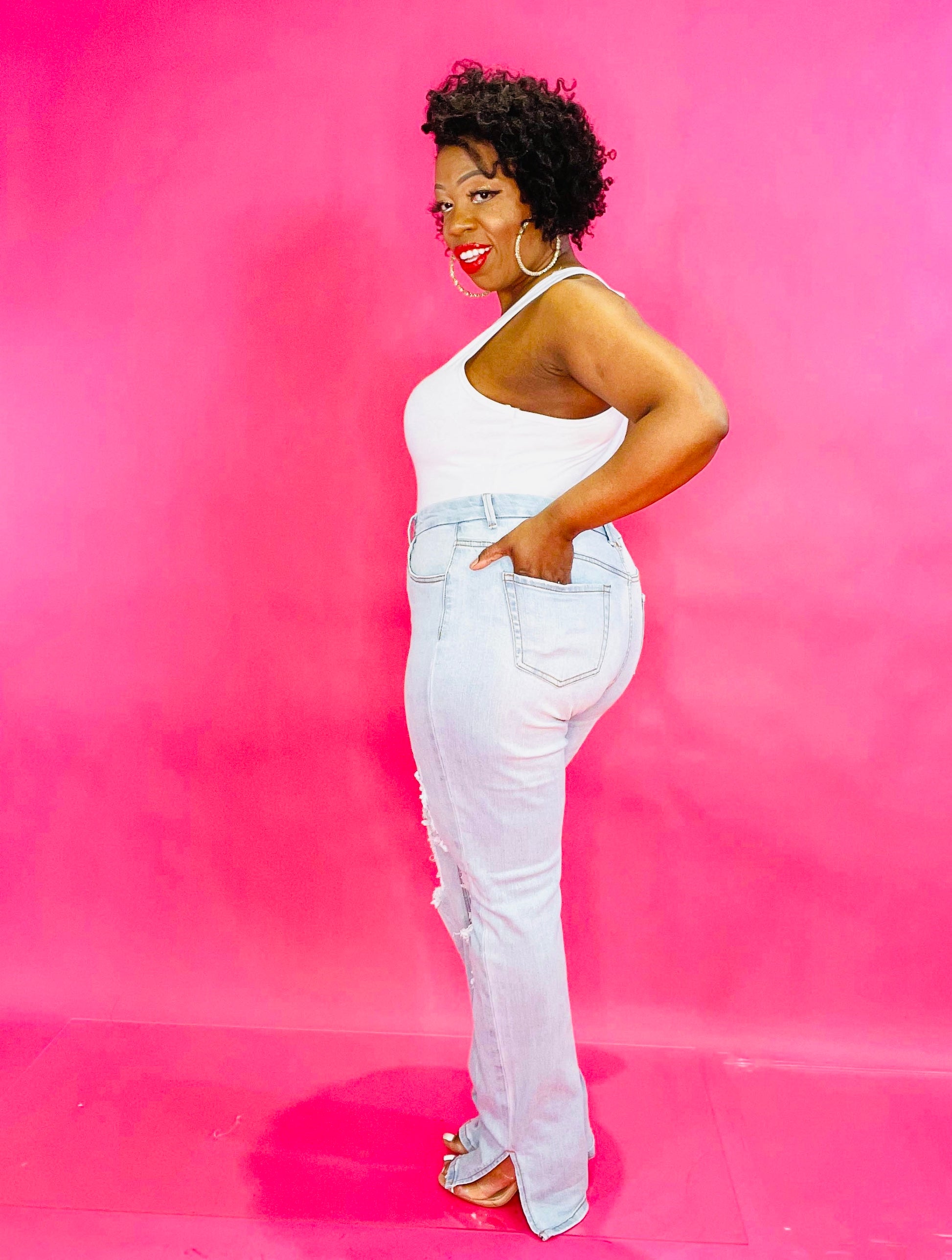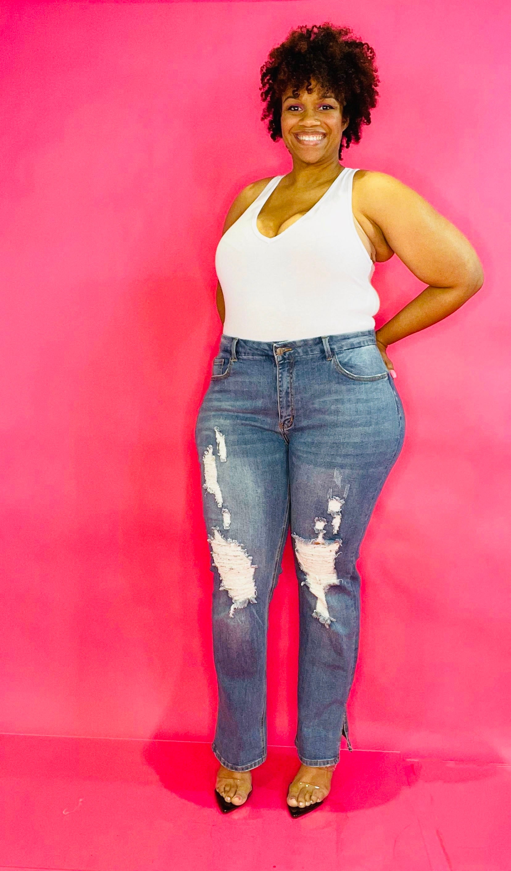 Distressed side leg split opening at ankle. Stretch denim 5 pockets button and zip closure.98% cotton 2% spandex.