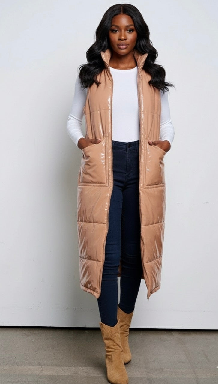 The Women's Sleeveless Zip-Up Front Pockets PU Leather Long Puffer Vest is the ultimate combination of fashion and function, perfect for the woman who wants to make a statement while staying warm.
